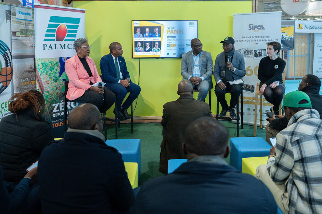 Alors que le stand continuait d’accueillir par vagues successives des visiteurs issus de divers domaines d’activités, SIFCA organisait un panel au Pavillon 5.1 / Stand de Max Havelaar. Co-animé par MM Kadja, Directeur pays pacte mondial des nations unies ; Didier Togbé, Directeur de l’INFPA ; Lamine Sanogo, vice-président de l’Apromac ; Raymond Bongo Tagouya, Directeur Développement et Approvisionnement PALMCI, Mme Lorri Roubass Pôle producteur Max Havelaar, et animé par Mme Ohouo Leatitia, Cheffe de Département Développement durable Groupe-SIFCA, ce panel s’est tenu autour du thème “Construire des synergies pour une agro-industrie durable et l’amélioration des conditions de vie des planteurs“, mettant en relief l’achat des produits aux planteurs au « juste prix » aligné sur les principes FIARTRADE.